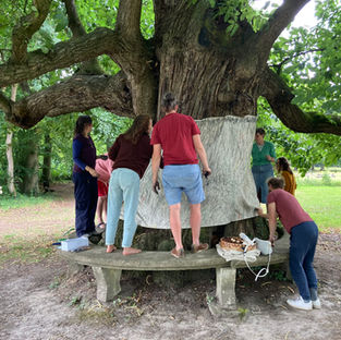 We maken eerst kennis met elkaar en met de locatie, bijvoorbeeld via een begeleide spiraalwandeling die, in steeds kleiner wordende cirkels, de geheimen van deze magische plek onthult. Of we luisteren naar het verhaal van een boomexpert.